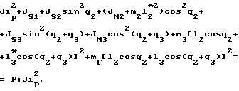 На выходах блоков 70, 71 и 78 умножения соответственно формируются сигналы:cos(q2)cos(q2+q3), Поэтому на выходе сумматора 72, входы которого имеют единичные коэффициенты усиления, формируется сигнал: На выходе блока 73 умножения формируется сигнал:![]() На выходе сумматора 74, первый вход которого /со стороны блока 73 умножения/ имеет единичный коэффициент усиления, а второй вход /со стороны блока 65 умножения/ – коэффициент усиления 2, формируется сигнал ![]() а на выходе блока 75 умножения – сигнал ![]() На выходах датчиков ускорения 79, 81 и 83 формируются сигналы соответственно. На выходах блоков умножения 80 и 82 соответственно формируются сигналы:![]() и ![]() Отрицательные входы сумматора 61 имеют единичные коэффициенты усиления, поэтому на его выходе формируется сигнал: ![]() На выходах блоков умножения 62 и 84, соответственно, формируются сигналы: Первый положительный вход сумматора 63 /со стороны блока 62 умножения/ имеет коэффициент усиления 1/ip2, а его второй /со стороны датчика 83 ускорения/ и третий /со стороны блока 84 умножения/ положительные входы – коэффициенты усиления Кв и 2/ip2, соответственно. В результате на выходе этого сумматора формируется сигнал: ![]() На первый положительный вход сумматора 3 /со стороны блока 2/ с коэффициентом усиления (1/JHip2) поступает сигнал (P + Jip2) , на его второй положительный вход /со стороны блока 52/ с коэффициентом усиления R/КмКуip2 – сигнал на третий отрицательный вход /со стороны блока 53/ с коэффициентом усиления K /(KyJNi2p) – сигнал на четвертый положительный вход с коэффициентом усиления R/KмKу /со стороны релейного элемента 54/ – сигнал:![]() на пятый положительный вход с коэффициентом усиления (K /Ky)+(KBR/KyKM) поступает сигнал где R – активное сопротивление якорной обмотки электродвигателя, Кв – коэффициент вязкого трения, Kу – коэффициент усиления усилителя 4, Kм – коэффициент крутящего момента, K – коэффициент противоЭДС, Мт = const > 0 – величина момента сухого трения при движении электродвигателя, а на шестой положительный вход с коэффициентом усиления L/КмКу – сигнал где L – индуктивность якорной обмотки электродвигателя.