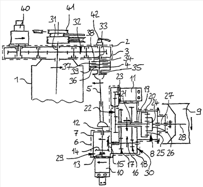 Коробка передач 2 служит далее для приведения в действие следующих агрегатов или механических приводов, как, например, генераторы 40, ременные приводы 41 или гидростатические насосы 42 для следующих компонентов.