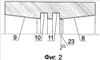В примере по другому варианту выполнения нагревательное устройство содержит генератор тепловой энергии – водогрейный котел 1, подающий 2 и обратный 3 трубопроводы, циркуляционный насос 4, радиатор 5 для передачи тепла в нагреваемое помещение. Позицией 6 обозначен первый трубопровод рециркуляции с элементом 7, содержащим конфузор 8, диффузор 9 и выполненные между конфузором 8 и диффузором 9 кольцевые канавки 10 и 11. Позицией 20 обозначен второй трубопровод рециркуляции с регулируемым клапаном 21. Управляющий блок (шкаф управления) 14 связан (электрически) с циркуляционным насосом 4 или клапаном 21 (показано пунктиром), а также с датчиком температуры (на чертеже не показан), расположенном в радиаторе 5. Позицией 22 обозначен нагнетательный насос, расположенный в первом трубопроводе рециркуляции 6. Параллельно расположенные линии обогрева 12 (Фиг.6) содержат насосы 13 с управляемым расходом перекачиваемой жидкости. Позицией 23 обозначено отверстие для прохода жидкости с регулируемым диаметром D элемента 7.