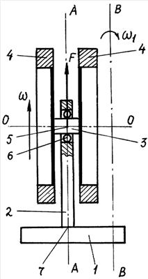 Определяющим условием функционирования гироскопического устройства является вращение ротора 4 с возможным вынужденным вращением 1 основания 1 вокруг линии оси В-B, не совпадающей с направлением линии оси 0-0 ротора. При этом со стороны ротора на подшипник 6 и ось 3 действует гироскопическая сила F, которая согласно известному свойству гироскопа стремится кратчайшим путем установить ось 3 ротора параллельно линии оси В-В, причем так, чтобы и вращение ротора и вынужденное вращение 1 основания были видны происходящими в одну сторону. Причем здесь рассматривается только действие сил без фактического перемещения оси 3, которая удерживается на опоре 2 при помощи подшипника 6. Известно, что центр масс любой механической системы, в том числе и ротора, проявляется как материальная точка, в которой сосредоточена масса всей системы и на которую действуют все силы, приложенные к системе (см. “Политехнический словарь” под ред. А.Ю.Ишлинского, изд. “Советская энциклопедия”, М. – 1980, стр.585). Следовательно и в предложенном гироскопическом устройстве возникающая гироскопическая сила F действует на центр массы 5 ротора, которая имеет одну точку опоры в виде подшипника 6. Вместе с тем, в связи с размещением центра массы 5 ротора, его подшипника 6 и центральной точки 7 соединения опоры 2 с основанием 1 на одной прямой линии А-А, здесь отсутствуют плечи для гироскопической силы F, что исключает возможность создания пары сил. Помимо этого, в данном случае гироскопическая сила является противодействующей к силе тяжести ротора.