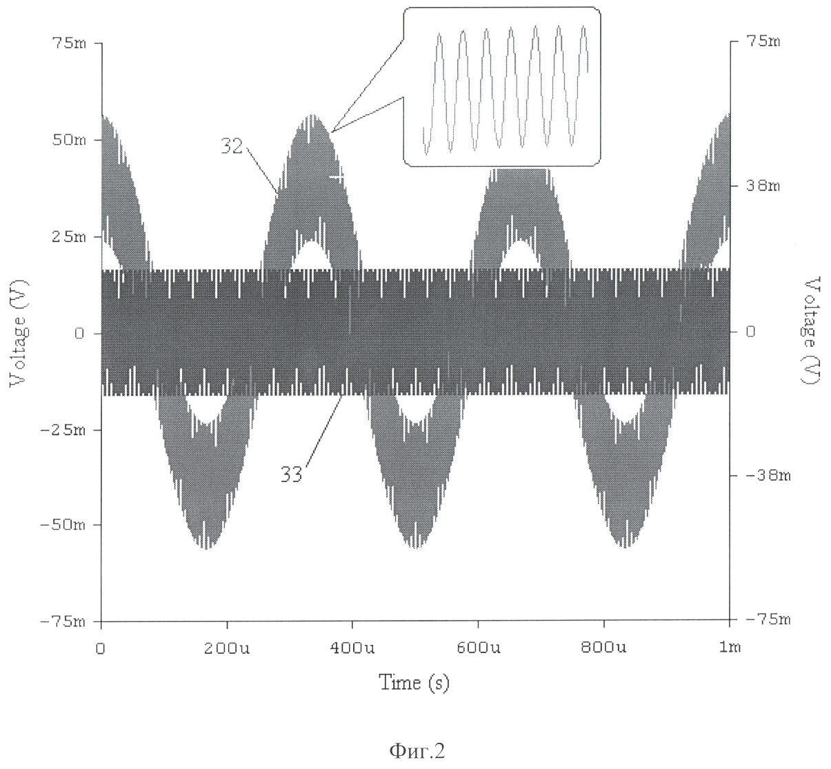 При реализации схемы ММГ с оконечным каскадом аналогично схеме в патенте США 6164134 сигналы управления из-за наличия паразитных связей в ММГ, образованных элементами 7, 10, 8 и 5, 9, 6, проходят в цепь измерения. Токи I1 и I2 поступают на входы ДТУ 14, причем направления токов на входе ДТУ 14 будут противоположны. Далее токи I1 и I2 преобразуются трансрезистивными усилителями, образованными соответственно элементами 15, 18 и 16, 19, в напряжения U1 и U2, которые суммируются дифференциальным усилителем 28. Сигнал 32 на выходе ДТУ 14 для случая синусоидальной формы управляющих сигналов с частотой 3 кГц представлен на фиг.2. Сигнал состоит из двух составляющих: высокочастотной составляющей, проходящей через измерительные емкости 3, 4 и трансрезистивные усилители образованные элементами 15, 18 и 16, 19 от источника синусоидального напряжения 21, и низкочастотной составляющей, равной сумме сигналов управления. Далее, сигнал поступает на вход демодулятора 20, проходит на выход преобразователя емкость-напряжение, представляя собой паразитный сигнал, который приводит к ухудшению точности ММГ.