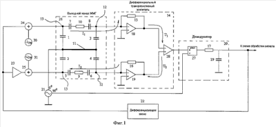 В случае разных значений паразитных емкостей и сопротивлений 7, 10, 8 и 5, 9, 6 между выходом дифференцирующего звена 22 и входом сумматора 24 или 25 может быть введен усилитель 23 с регулируемым коэффициентом усиления.