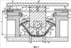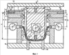 По мере изгиба образца боковые поверхности двух изогнутых полок образца касаются двух индикаторов 7, 9 с горизонтальным осями. После опускания краев образца ниже матриц 2, 11 образец разгружается и его изогнутые полки начинают расходиться под воздействием упругих деформаций. Оба индикатора 7, 9 показывают увеличивающееся отклонение полок образца от вертикальной линии. Чтобы образец произвольно не падал и оставался в контакте с пуансоном, его поддерживают снизу подпружиненными толкателями 16. Сила, с которой толкатели воздействуют на образец, небольшая, чтобы не вызвать деформирование образца.