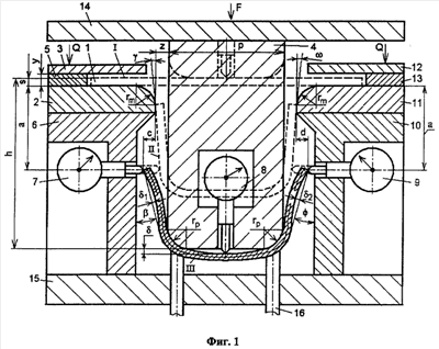 II – момент изгиба, когда левый и правый края образца 1, показанного пунктирной линией, одновременно касаются нижних точек закругленных кромок двух матриц радиуса rm после изгиба от горизонтали по двум закругленным рабочим кромкам пуансона радиуса rp на максимальные углы, близкие к 90° и равные соответственно 90°- и 90°- ; в этот момент левая и правая полки образца отклонены от вертикали в зазоре z между пуансоном и двумя матрицами на исходные углы и ;
