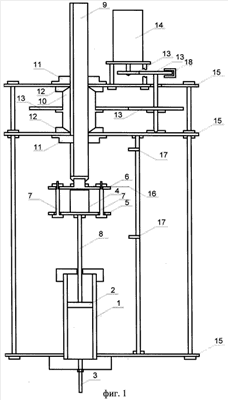 В заборной емкости 1 поршень 2 совершает возвратно-поступательное движение. Это движение создается с помощью винта с направляющим пазом 9. Он движется вертикально по втулкам с направляющими шипами 11, которые не дают ему возможности вращаться. Винт приводится в движение гайкой 10, которая в свою очередь вращается системой зубчатых колес 13 от приводного электродвигателя постоянного тока 14, который управляется блоком регулировки и стабилизации оборотов. Винт 9 соединен с поршнем 2 через блок измерения усилия, в состав которого входят: неподвижная платформа 6, подвижная платформа 5, направляющие 7 и датчик усилия 4. При измерении вязкости, то есть, когда поршень движется вниз, жидкость выдавливается через капилляр 3. При этом за счет вязкости жидкости создается противодействие движению поршня 2. Это приводит к тому, что подвижная платформа 5, соединенная штоком 8 с поршнем, скользит по направляющим 7 и деформирует чувствительный элемент датчика усилия 4. Начало рабочего участка цилиндра определяется программно, а его протяженность – с помощью оптопары 18, смонтированной на одном из зубчатых колес, которое также выполняет роль обтюратора. При заборе исследуемой жидкости, то есть когда поршень 2 движется вверх, датчик усилия 4 находится в свободном положении, а движение поршню 2 передается через подвижную платформу 5, которая в этот момент упирается в выступы на направляющих 7. Это необходимо для связи подвижной платформы 5 и неподвижной платформы 6 при заборе жидкости. Жидкость засасывается через капилляр 3. Реверс электродвигателя постоянного тока 14 осуществляется с помощью конечных выключателей – герконов 17, которые замыкаются магнитом, закрепленным на шторке 16, в моменты, когда поршень 2 находится в крайних верхнем или нижнем положениях. Вся конструкция смонтирована на станине 15.