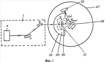 В камере 27 находятся также анализатор 30 энергий электронов с детектором 31 электронов и детектор 32 рентгеновского излучения, снабженные соответственно устройствами 33 и 34 независимого поворота относительно вертикальной оси вращения гониометра 29. Кроме этого, устройство 33 позволяет производить радиальные возвратно-поступательные перемещения анализатора 30 с детектором 31, необходимые для совмещения исследуемого кристалла 28 с фокусом анализатора 30.