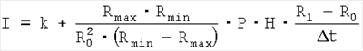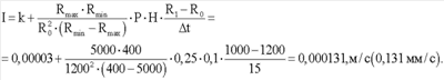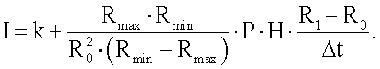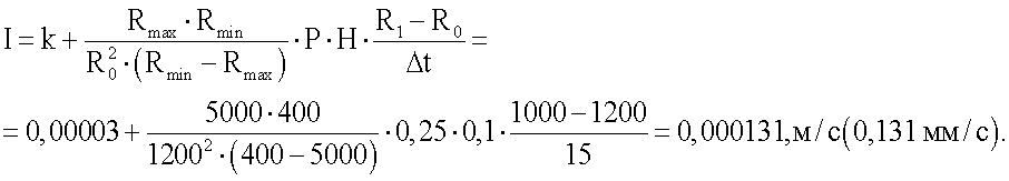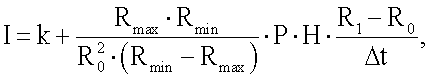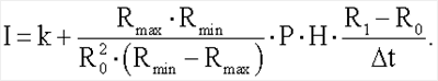, где I – скорость инфильтрации дождевой воды в грунт; k – коэффициент фильтрации грунта; Rmax и Rmin – значения электрического сопротивления грунта соответствующие минимальному и максимальному значению объемной влажности грунта; R0 и R1 – значение электрического сопротивления грунта в начале и в конце измерения; Р – пористость грунта; Н – глубина залегания электродов.