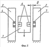 При определении положения объектов, имеющих неконтролируемое вращение вокруг оси, параллельной направлению движения (например, объекта 1, перемещающегося сверху вниз в направляющей 2 в виде трубы или стержней, как показано на фиг.5), источник магнитного поля может быть выполнен в виде кольцевого постоянного магнита 6 с радиальной намагниченностью, охватывающего объект, причем плоскость магнита перпендикулярна направлению движения объекта. В этом случае преобразователь магнитного поля 4 будет фиксировать прохождение кольцевого магнита в момент времени t0 (фиг.2) независимо от вращения объекта вокруг оси, параллельной направлению движения объекта. При наличии неконтролируемого зазора между объектом и основанием датчик может быть дополнительно снабжен преобразователем магнитного поля (катушкой 7 индуктивности на фиг.5), установленным на основании со стороны, противоположной первому преобразователю магнитного поля (катушке 4), и соединенным с ним последовательно-согласно по отношению к магнитному полю кольцевого магнита. В этом случае суммарный сигнал с преобразователей не будет зависеть от величины зазора , поскольку если у одного из преобразователей зазор увеличивается, то у противоположного преобразователя он уменьшается (соответственно на первом преобразователе эдс уменьшается, на втором – увеличивается). Кроме того, увеличивается совокупная чувствительность преобразователей магнитного поля, а также снижается влияние на преобразователи сторонних однородных магнитных полей (как переменных, так и постоянных) в месте их расположения.