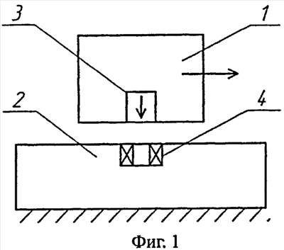Устройство работает следующим образом. При движении объекта 1 (фиг.1, 3) с расположенным на его периферийной части постоянным магнитом 3 относительно основания (направляющей) 2 (например, неподвижного) в месте расположения преобразователя магнитного поля (катушки индуктивности 4 на фиг.1 или измерителя 5 магнитного поля в виде датчика Холла на фиг.3) возникает переменное магнитное поле. При использовании в качестве преобразователя катушки 4 индуктивности с осью чувствительности, перпендикулярной направлению движения объекта (фиг.1), эдс на выходе катушки имеет вид, показанный на фиг.2. Переход эдс е катушки через нуль соответствует времени t0, когда центр магнита 3 находится напротив центра катушки 4. Пиковые значения эдс в этом случае зависят от скорости движения объекта относительно основания и зазора между ними.
