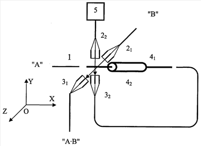 Таким образом, на выходе устройства «А·В» формируется сигнал, интенсивность которого пропорциональна (с коэффициентом 1/K) произведению интенсивностей поданных оптических сигналов.