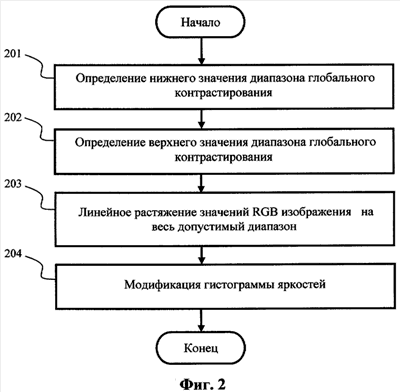 Оценку изображения выполняют на основе анализа двух наименьших и двух наибольших байтов глобальной гистограммы. Растяжку гистограммы, т.е. коррекцию глобального контраста выполняют с использованием эмпирически оцененных порогов Н0 и Т.