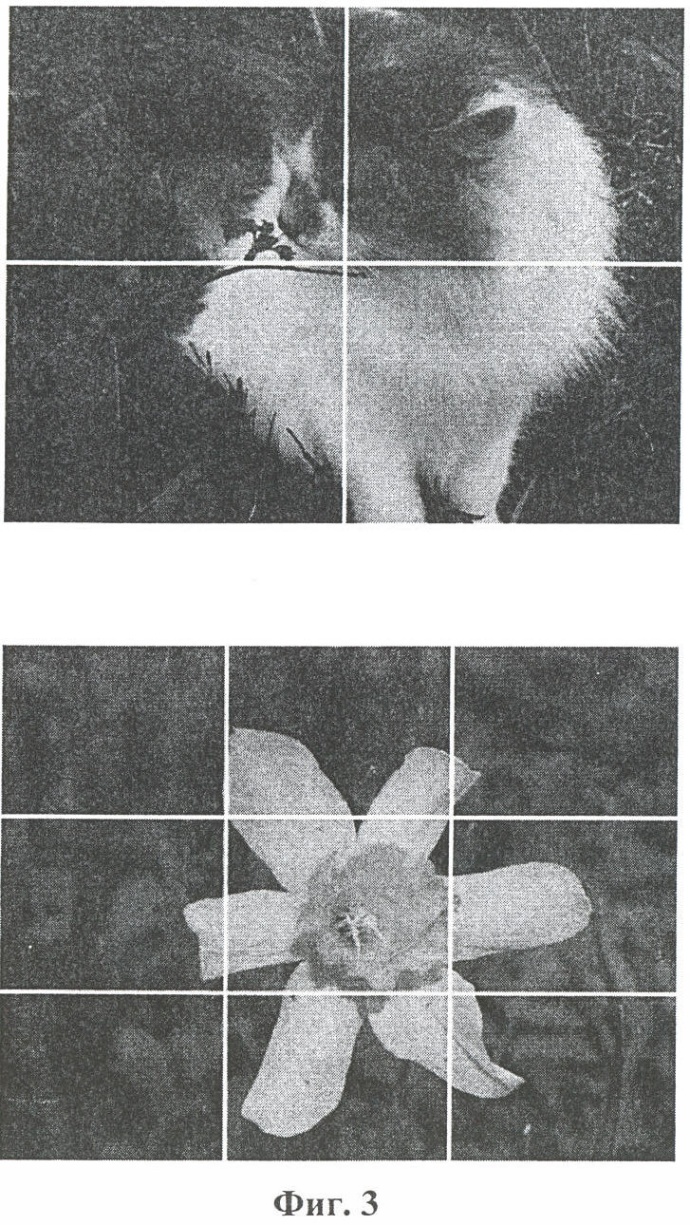 Помимо оценки качества целого изображения изображение может быть сегментировано на несколько блоков, каждый из которых имеет собственную локальную гистограмму. Фиг.3 демонстрирует процедуру деления изображения, при котором исходное изображение делят на 4 и 9 блоков. Такое разбиение в процедуре оценки качества изображения аналогично многоуровневому представлению изображения, используемому в алгоритмах поиска соответствий на изображениях или нахождению областей интереса изображения для адаптивной коррекции экспозиции (См., например, L. Shu, М. Т. Özsu, V. Oria, R. Ng, “An Extendible Hash for Multi-Precision Similarity Querying of Image Databases”. Proceedings of the 27th International Conference on Very Large Database Systems (VLDB), Rome Italy, September 2001, p.221-230[8]; G.Messina, A.Castorina, S.Battiato, A.Bosco, “Image Quality Improvement by Adaptive Exposure Correction Techniques”. Proceedings of IEEE ICME*03 International Conference on Multimedia and Expo 2003, Vol.I, p.549-552, Baltimore USA, July 2003 [9]). Разбиение на части является важным этапом в дополнительном определении визуально значимых областей внутри изображения и более точной оценки его качества с точки зрения погрешностей экспозиции, если таковые присутствуют. Так как число разбиений по вертикали и горизонтали одинаково, результирующие прямоугольники имеют такое же отношение сторон, как и в исходном изображении. Размер блока является важным параметром алгоритма.
