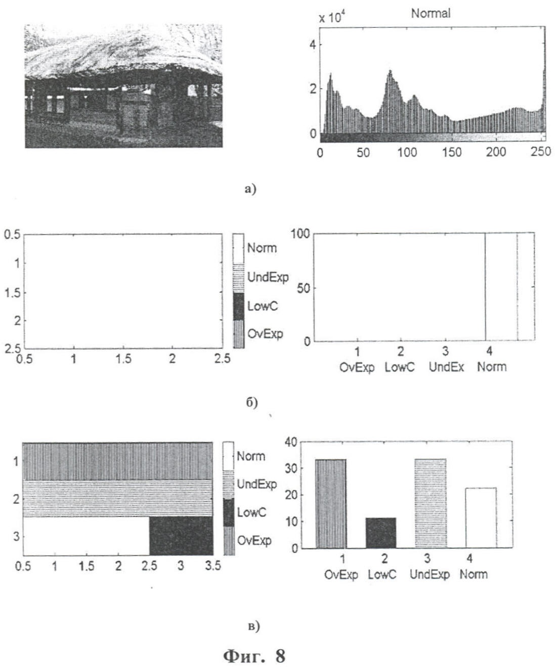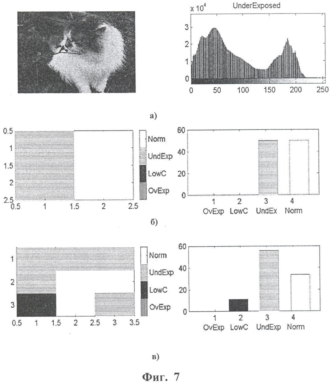 Фиг.7 демонстрирует результаты классификации недоэкспонированного изображения (а), произведенной на основе его анализа в целом, а также его соответствующую классификацию по четырем (б) и девяти (в) блокам. Гистограмма исходного изображения и результаты его классификации приведены справа. Темная (недоэкспонированная) область отмечена горизонтальной штриховкой, низкоконтрастная область обозначена черным цветом, а светлая, т.е переэскспонированная – вертикальной штриховкой. Области с корректной экспозицией не окрашены. Можно видеть, как увеличение числа областей проявляет тонкую структуру изображения.