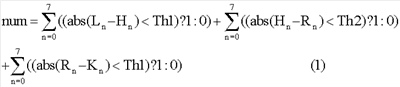 В приведенной выше формуле abs (A-B) представляет собой операцию взятия абсолютной величины (A-B). Этот же способ применим и к горизонтальной границе. Рассчитываются разности между тремя группами пикселей в горизонтальном направлении, а затем вычисляется сумма разностей для получения параметра «num». Символ «?» означает взятие величины А из А:В, если величина перед символом больше 0, и взятие величины В, если величина перед символом равна или меньше 0.