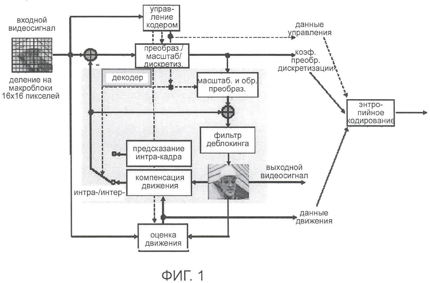 Схема осуществления сжатия стандарта Н.264 приведена на фиг.1. Основным элементом обработки является макроблок размером 16×16. Применяются ведущие технологии, такие как использование нескольких опорных кадров (multi-frame reference), предсказание без использования компенсации движения (intra prediction), режим обработки многих макроблоков (multi-macroblock mode), интегральное преобразование и дискретизация 4×4, пространственная фильтрация, компенсация движения по 1/4 пикселя, контекстно зависимое адаптивное кодирование с переменной длиной кодового слова (Context Adaptive Variable Length Coding, CAVLC), контекстнозависимое адаптивное бинарное арифметическое кодирование (Context Adaptive Binary Arithmetic Coding, CABAC), энтропийное кодирование и т.п.По этим причинам степень сжатия по сравнению с MPEG-2, H.263 и MPEG-4 ASP удваивается.