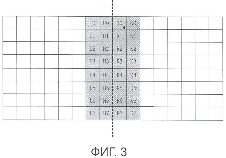 Под так называемыми сходными пикселями имеются в виду пара пикселей с разностью величин пикселей меньшей, чем пороговая величина равномерности. Пороговая величина равномерности может быть получена поиском в таблице посредством индекса, вычисляемого через среднюю величину QP (параметра дискретизации), обозначаемую QPav, двух кодовых блоков. Под числом сходных пикселей имеется в виду сумма пар сходных пикселей на одной стороне и на обеих сторонах края кодового блока. Как показано на фиг.3, Ln, Hn, Rn, Kn (0<=n<=7) представляют собой 32 пикселя на границе кодового блока, и параметр “num” рассчитывается по следующей формуле: