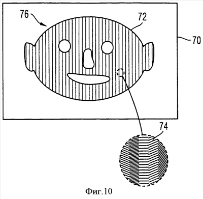 Фиг.10 – дифракционная структура в соответствии с дополнительным примером реализации изобретения, при котором открытая визуальная информация образована благодаря форме и положению тех элементов с решеткой, которые создают скрытую информацию.