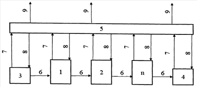 На чертеже показаны производственные подразделения организации (1, 2, , n), склад материалов, полуфабрикатов, комплектующих изделий (3), склад готовой продукции (4), ЭВМ-сервер (5), направление перемещения ресурса и карточек учета, маршрут изготовления ресурса (6), направление электронной передачи данных о факте регистрации движения ресурса в ЭВМ-сервер (7), направление электронной передачи данных для целей управления на уровне производственных и складских подразделений организации (8), а также электронной передачи данных для целей управления на уровне организации в целом (9).