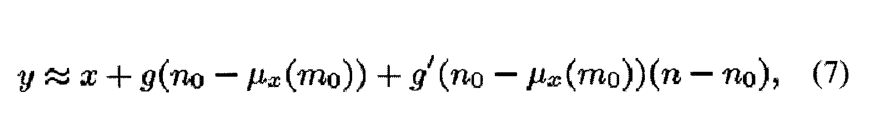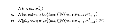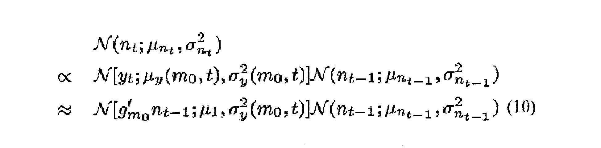 Для вероятности p(yt|nt) данных, которая является не гауссовой (и будет кратко описана), апостериорное распределение обязательно является не гауссовым. Последовательное применение уравнения 1 дало бы в результате быстрое расширение комбинации предыдущих апостериорных распределений и привело бы к неустойчивым представлениям. Необходима апроксимация, чтобы преодолеть неустойчивость. Апроксимацией, которая используется, является разложение в ряд Тейлора первого порядка, чтобы линеаризировать нелинейную зависимость между yt и nt. Это приводит к гауссовому представлению p(yt|nt). Следовательно, априорная ФРВ p(n +1) изменяющегося во времени шума, которая унаследована из апостериорной вероятности для предыстории данных p(n у1 ), может быть аппроксимирована с помощью гауссова распределения