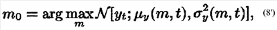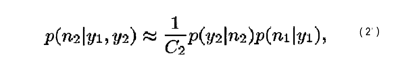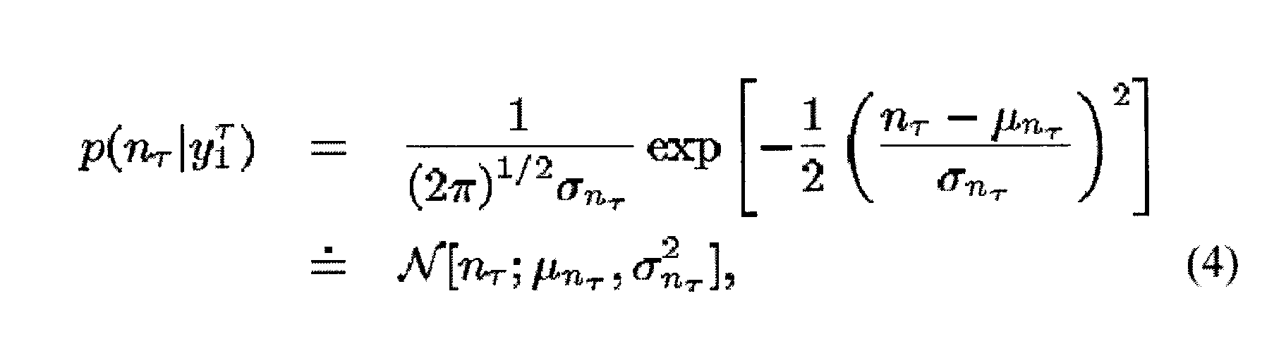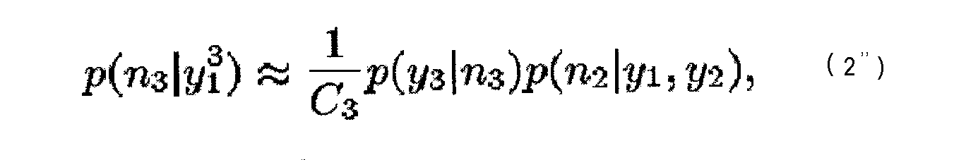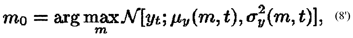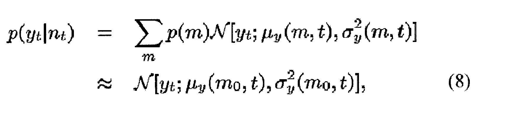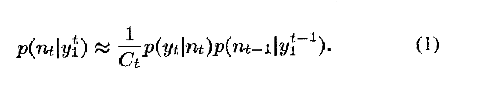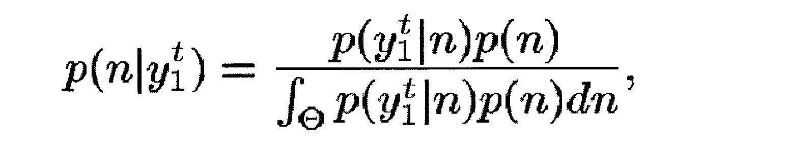 Как будет показано ниже, чтобы разработать этот алгоритм, используют гауссову оценку для p(yt|nt). Несмотря на то, что вышепредставленное описание использовало разложение в ряд Тейлора и аппроксимацию Лапласа для обеспечения гауссовой оценки для p(yt|nt), следует понять, что могут быть использованы другие способы для обеспечения гауссовой оценки не выходя за рамки объема настоящего изобретения. Например, кроме использования аппроксимации Лапласа в уравнении (8) могут быть использованы численные способы для аппроксимации или гауссовой модели смеси (с малым числом составляющих).