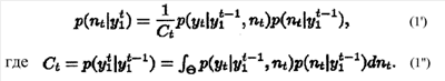у1 t-1 при условии nt или p(уt|y1 t-1,nt)=p(yt|nt) и допуская плавность в апостериорном распределении: p(nt|y1 t-1) p(nt-1|y1 t-1), предыдущее уравнение может быть записано как: