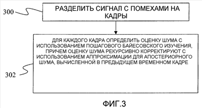 Как применяемое к шуму пошаговое байесовское изучение корректирует текущее априорное распределение относительно шума, используя апостериорное распределение, при условии наблюдаемых данных до самого недавнего последнего момента, поскольку это апостериорное распределение является наиболее полной информацией относительно параметра, предшествующего текущему моменту времени. Этот способ проиллюстрирован на фиг.3, на которой на первом этапе сигнал 300 с помехами разделяют на кадры. На этапе 302 для каждого кадра применяют пошаговое байесовское изучение, причем оценка шума каждого кадра допускает априорное распределение изменяющегося во времени шума и оценку шума рекурсивно корректируют, используя аппроксимацию для апостериорного шума, вычисленного в кадре предыдущего момента времени. Следовательно, апостериорная последовательность в уравнении 3 становится изменяющейся во времени априорной последовательностью (т.е. перед изменением) для рассматриваемых параметров распределения шума (со сдвигом времени на один кадр). В одном варианте осуществления этап 302 может включать в себя вычисление вероятности p(yt|nt) данных для текущего кадра в то же время при использовании оценки шума в предыдущем кадре, предпочтительно в непосредственно предыдущем кадре, которое предполагает плавность апостериорного распределения, как указано с помощью уравнения 1.