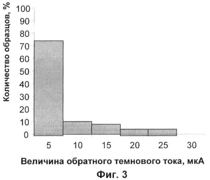 на фиг.3 изображена гистограмма темновых токов при обратном смещении – 0,2 В для пластин с гетероструктурами, боковая поверхность которых не обрабатывалась;
