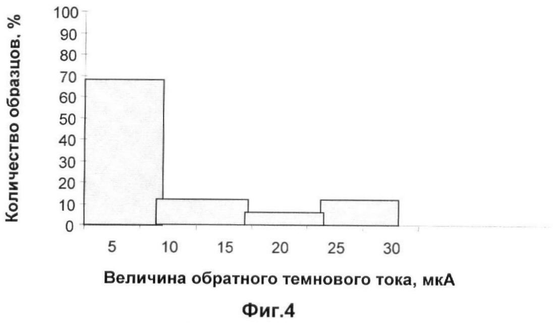 на фиг.4 изображена гистограмма темновых токов при обратном смещении – 0,2 В для пластин с гетероструктурами, боковая поверхность которых обрабатывалась способом-прототипом;