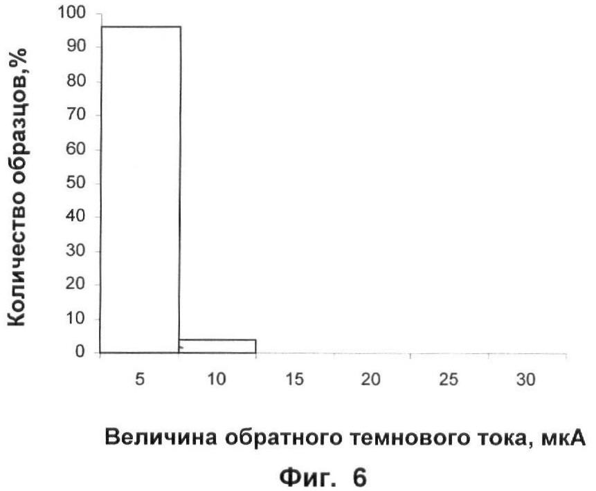 на фиг.5 изображена гистограмма темновых токов при обратном смещении – 0,2 В для пластин с гетероструктурами, боковая поверхность которых обрабатывалась заявляемым способом;