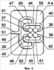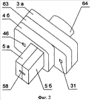 На фиг.1-10 обозначено: 1 – узел излучателей; 2 – узел поляризаторов; 3 – первый Е-плоскостной волноводный узел; 3а, 3б – полукорпуса первого Е-плоскостного волноводного узла; 4 – второй Е-плоскостной волноводный узел; 4а, 4б – полукорпуса второго Е-плоскостного волноводного узла; 5 – третий Е-плоскостной волноводный узел; 5а, 5б – полукорпуса третьего Е-плоскостного волноводного узла; 6, 7, 8, 9 – волноводные излучатели; 10, 11, 12, 13 – поляризаторы; 14, 15, 16, 17 – первые возбуждающие волноводы каналов; 18, 19, 26, 46 – согласованные нагрузки; 20, 21, 22, 23, 27, 28, 30, 40, 41, 42, 43, 47, 48, 50, 52, 53, 55, 57 – соединительные волноводы; 24, 25, 29, 44, 45, 49, 56 – двойные волноводные тройники; 31 – вход передающего канала; 32, 33, 34, 35, 59, 60, 61, 62 – отрезки волноводов каналов; 36, 37, 38, 39 – вторые возбуждающие волноводы каналов; 51 – выход первого разностного приемного канала, 54 – выход второго разностного приемного канала, 58 – выход суммарного приемного канала; 63 – единая часть корпуса, объединяющая соприкасающиеся полукорпуса первого и второго Е-плоскостных полноводных узлов; 64 – единый волноводно-поляризационный узел, содержащий узел излучателей и узел поляризаторов; 65 – плоскость разъема полукорпусов первого Е-плоскостного волноводного узла; 66 – плоскость разъема полукорпусов второго Е-плоскостного волноводного узла; 67 – плоскость разъема полукорпусов третьего Е-плоскостного волноводного узла.