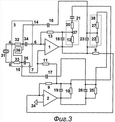 Зарядовый сигнал от пьезодатчика 31 поступает на входы 4 и 5 и проходит через ограничительный узел 3 на вход операционного усилителя 1. Данный усилитель охвачен отрицательной обратной связью через конденсаторы обратной связи 16 и 17 и резисторы обратной связи 11 и 13. Напряжение с выхода операционного усилителя 1 поступает на цепи обратной связи с делителя 37, образованного параллельно соединенными резистором 12 и конденсатором 18, и резистором 20. Поскольку в делителе имеется конденсатор 18, коэффициент передачи зависит от частоты. На прямой вход операционного усилителя через аналогичные цепи сигнал подается с выхода операционного усилителя 3, который инвертирует выходной сигнал операционного усилителя 1.