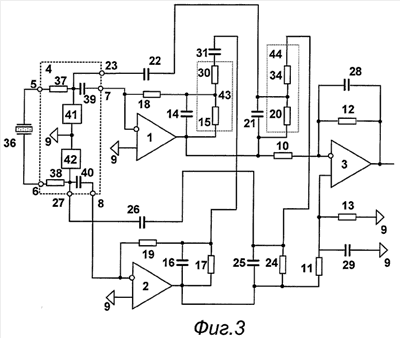 Зарядовый сигнал от пьезодатчика 36 поступает на входы 5 и 6 и проходит через ограничительный узел 4 на входы операционного усилителя 1 и операционного усилителя 2. Данные усилители охвачены отрицательной обратной связью через конденсаторы обратной связи 22 и 26 по переменному току и через резисторы обратной связи 18 и 19 по постоянному току. Напряжение с выхода операционного усилителя 1 поступает на цепи обратной связи с делителей 43 и 44, образованных параллельно соединенными резистором 15 и конденсатором 14 и резистором 30, а также параллельно соединенными резистором 20 и конденсатором 21 и резистором 34. Поскольку в делителе имеется конденсатор 14, коэффициент передачи зависит от частоты. Аналогичная схема обеспечивает обратную связь для операционного усилителя 2.