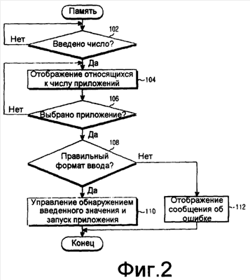 Однако, если введенное число соответствует формату числового ввода выбранного приложения, контроллер 2 переходит к этапу 110 для того, чтобы запустить ассоциированное приложение, управляя ассоциированным приложением так, чтобы оно обнаружило введенное число в качестве значения ввода предопределенной области ввода. В качестве альтернативы, контроллер 2 может временно сохранить число, введенное пользователем, в памяти 12 и ввести это введенное число в ассоциированную область ввода приложения.