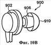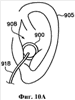 На фиг.10A-10C показан головной телефон 900, содержащий любой из вариантов осуществления устройства двусторонней связи, описанных выше. Головной телефон 900 содержит патрубок 906, который проникает и удобно умещается во внешнем ушном канале 908 уха 905 пользователя. Патрубок 906 включает в себя похожий на зонтик колпачок 910 из мягкого эластичного материала, который приспосабливается к форме внешнего слухового канала 908. Верхушка колпачка 910 имеет отверстие 912, которое предоставляет воздуху возможность проходить к трансдюсеру в аналоговом сигнальном процессоре 914 в пределах корпуса 902.