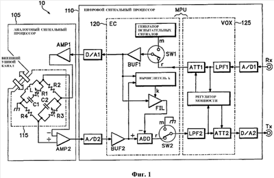 На фиг.1 представлена структурная схема полнодуплексного устройства 10 двусторонней связи согласно одному из вариантов осуществления изобретения. Устройство 10 содержит аналоговый сигнальный процессор (ASP) 105 с пьезоэлектрическим трансдюсером (или катушкой L) и цифровой сигнальный процессор (DSP) 110. DSP 110 содержит первый цифроаналоговый (D/A) преобразователь D/A1, первый аналого-цифровой (A/D) преобразователь A/D1, второй A/D-преобразователь A/D2, MPU и второй D/A-преобразователь D/A2. MPU может быть воплощен одним DSP и/или CPU или множеством DSP и CPU.