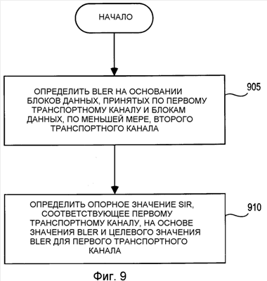 Способ для управления мощностью согласно варианту осуществления по фиг.6А проиллюстрирован на фиг.10. Определяется (920) общее значение BLER блоков данных, принятых по множеству транспортных каналов. Также определяется (925) общее целевое значение BLER для множества транспортных каналов. Опорное значение SIR, соответствующее множеству транспортных каналов, определяется на основании общего значения BLER и целевого значения BLER (930).