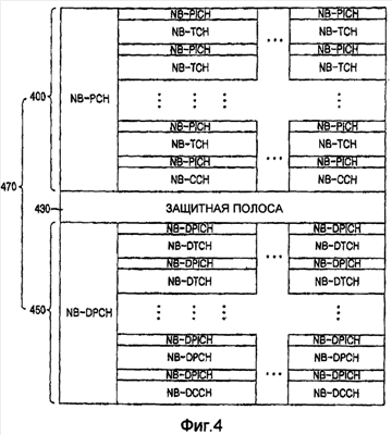 Ссылаясь на фиг. 4, кадр 470 нисходящей линии связи EB-системы связи (далее упоминаемый как “кадр нисходящей линии связи EB-системы связи”) включает в себя кадр 400 нисходящей линии связи, в настоящее время используемый в NB-системе связи (далее упоминаемый как “кадр нисходящей линии связи NB-системы связи”), кадр нисходящей линии связи, зависимо добавленный в NB-систему связи для EB-системы связи, т.е. зависимый от NB-системы связи кадр 450 нисходящей линии связи, и защитную полосу 430 между кадром 400 нисходящей линии связи NB-системы связи и зависимым от NB-системы связи кадром 450 нисходящей линии связи.
