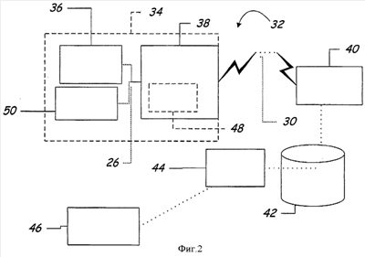 Как показано на фиг.3, система 32 может быть выполнена так, что в состав платы радиосвязи 38 будет входить записывающее запоминающее устройство, содержащее программируемый код 48, для регистрации наличия условий аварийной сигнализации, так, что если регистрируемые преобразователем данные опускаются ниже запрограммированного уровня, плата радиосвязи 38 способна регистрировать наличие условий аварийной сигнализации и инициализации аварийного сигнала путем вызова приемопередатчика 40. В сущности, плата радиосвязи 38 может быть запрограммирована на автоматическую выдачу аварийного сигнала. Некоторые системные программы уже применялись для написания игровых программ и программ для сотовых телефонов типа J2ME компании Сан Майкросистемс (Sun Microsystems), и те же самые программы использовались для программирования плат радиосвязи 38.