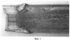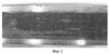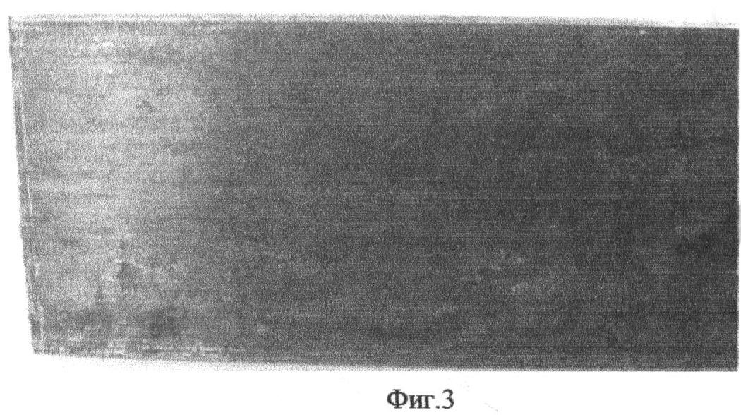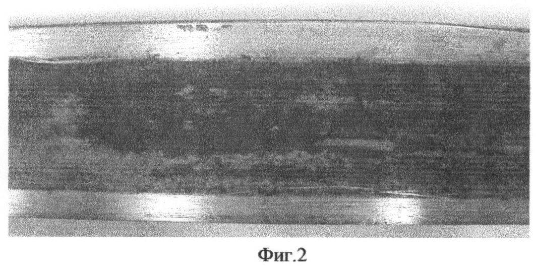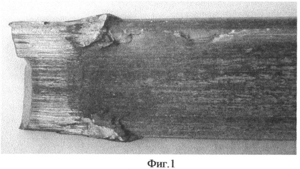 На фиг.1 приведена фотография, на которой хорошо видны «излишние» объемы металла в виде волн 1 и 2, вышедшие на большие грани полосы при ее деформации в рабочей зоне и образовавшиеся из-за отсутствия пространства для затекания металла в углы рабочей зоны при радиусе закругления углов рабочей зоны, равных ~1 мм, т.е. в пределах, рекомендованных известным техническим решением [7]. На фотографии показан задний, т.е. непротянутый, конец заготовки, извлеченный из волоки в направлении, обратном направлению волочения, после обрыва полосы в процессе волочения. Таким образом, ясно, что при использовании наиболее близкого аналога вследствие неблагоприятной схемы деформации металла неизбежны следующие недостатки, подтвержденные практикой выпуска промышленных партий полос в производстве заявителя: интенсивный износ волочильного канала в рабочей и калибрующей зонах из-за трудности поступления в них смазки в местах образования «излишних» объемов металла при больших значениях радиусов закругления углов канала, повышенная обрывность при волочении, ухудшение качества поверхности полос.