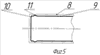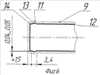 На фиг.2 приведена фотография, на которой видны блестящие участки (наплывы) 3 и 4 на поверхности большой грани протянутой полосы, свидетельствующие об отсутствии смазки на их поверхности при волочении через известную волоку с отношением r/h 0,25, в отличие от остальной матовой поверхности 5, что подтверждает факт достаточного поступления смазки для создания режима граничного трения на остальной части поверхности 5 большой грани полосы. На фиг.3, в противоположность фиг.2, показана фотография полностью матовой поверхности большой грани полосы, протянутой через предлагаемую волоку с волочильным каналом, у которого радиус закругления углов рабочей зоны составляет 0,042 толщины сечения калибрующей зоны (т.е. r/h=0,125/3=0,042) или, что то же самое, 0,042 толщины сечения полосы согласно заявляемому техническому решению. На фиг.4, 5 и 6 схематично показаны контуры заготовок и полос, полученных в результате особенностей течения металла за три прохода волочения при использовании известной волоки, имеющей радиус закругления углов рабочей зоны волочильного канала, равный 0,25 толщины поперечного сечения калибрующей зоны (т.е. r/h=0,25); на фиг.4, 5 и 6 приняты следующие обозначения: 6 – контур горячекатаной заготовки с боковой стороной 7, имеющей выпуклость в результате свободного уширения при прокатке; 8 – контур промежуточной заготовки, полученной в первом проходе волочения; 9 – контур промежуточной заготовки после второго прохода волочения с упомянутым закруглением в углах 10 и наплывом металла 11 на большой грани полосы; 12 – контур полосы после трех проходов волочения с наплывом металла 13 при наличии упомянутого закругления 14. На фиг.7 схематично приведен фрагмент поперечного сечения твердосплавной волоки 15 по калибрующей зоне 16 с характерным видом износа в виде углублений в твердом сплаве 17, если рабочая зона волочильного канала выполнена с закруглениями углов 18, радиус которых равен ~0,3 толщины поперечного сечения калибрующей зоны (т.е. r/h 0,3) согласно известному техническому решению.