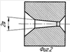 Однако достижению, как минимум, граничного трения препятствуют, кроме больших удельных давлений, высокие значения угла наклона рабочей зоны волочильного канала, выполненного согласно известным техническим решениям, – от 6 градусов [1, 5, 6] до 20 градусов [1, 6, 8]. Последнее уверенно подтверждается накопленным негативным производственным опытом заявителя, использовавшего ранее при выпуске промышленных партий полос из нихрома волоки с каналом известной формы и углами =8-12°. Путем фиксации обрывности при волочении и контроля за состоянием поверхности полос после волочения (наличие или отсутствие смазки – порошка натриевого мыла с добавками, качество поверхности), а также наблюдениями за процессом втягивания смазки в волочильный канал заявитель может констатировать следующее. При использовании известных из уровня техники и рекомендованных углов наклона рабочей зоны к оси канала и при значениях этого угла в производстве заявителя в интервале от 8 до 12 градусов преобладающее количество смазки выдавливается в направлении, обратном направлению волочения, и не поступает в волочильный канал. Результатом этого являются:
