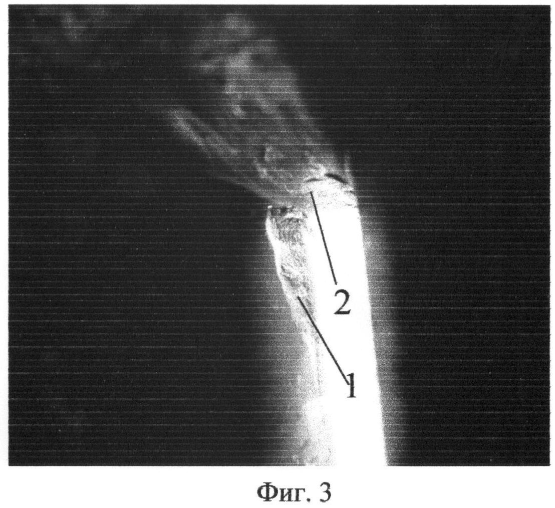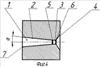 На фиг.2 приведена известная стандартная (не удлиненная) твердосплавная волока с каналом традиционного профиля; на фиг.3 (с увеличением х5) – фотография, иллюстрирующая характер износа поверхности канала известной волоки (фиг.2) по большим и малым граням профиля в районе рабочей и калибрующей зон. На фиг.3 введены следующие обозначения: 1 – характерный вид износа большой грани рабочей зоны волочильного канала; 2 – характерный вид износа малой грани рабочей зоны волочильного канала. На фиг.4 – заявляемая твердосплавная волока с предлагаемым в настоящей заявке профилем волочильного канала. На фиг.4 введены следующие обозначения: 1 – волочильный канал предлагаемой конфигурации; 2 – рабочая зона канала с углом ее наклона к оси канала =3-6 градусов, объединенная с входной зоной; 3 – калибрующая зона канала; 4 – выходная зона канала; 5 – фаска в месте перехода рабочей зоны в калибрующую; 6 – фаска в месте перехода калибрующей зоны в выходную; 7 – угловая кромка рабочей зоны.