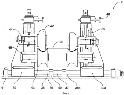 На Фиг.4 показана вертикальная проекция сзади типичной клети 7 неприводных формирующих роликов, где две рамы 35 установлены на основании 36 с возможностью их относительной боковой регулировки валом 37, имеющим резьбы 38, 38а противоположных направлений, взаимодействующие с соответствующими блоками 39, 39а. Рамы 35 можно скользяще регулировать между внутренним и внешним фиксаторами 40, 41 соответственно.