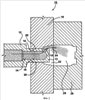 Неподвижная полуформа 18 содержит полость 19, а запорная часть 32 закреплена на неподвижной полуформе 18 с помощью болтового соединения (не показано). Болт 33 крепит нагреватель 34 к запорной части 32. На запорной части 32 установлены нагреватель 34, охлаждающее средство 36 и датчик 38 температуры (например, термопара). Крепление нагревателя 34, охлаждающего средства 36 и датчика 38 температуры к запорной части 32 обусловливает то преимущество, что при необходимости технического обслуживания нагревателя 34 и/или охлаждающего средства 36 и/или датчика 38 запорная часть 32 может быть извлечена, а на ее место вставлена запасная запорная часть 32.