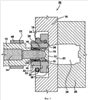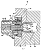 ДУСМС 50 содержит стопор 52, который выполнен так, чтобы размещаться в камере 59, которая расположена в неподвижной полуформе 58. Пружина 54 расположена между стопором 52 и запорной частью 32.