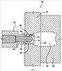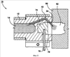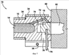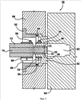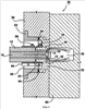 Средство 18 закрывания выпускного отверстия изображено в виде неподвижной полуформы. Однако следует принять во внимание, что средство закрывания выпускного отверстия также может представлять собой другую конструкцию, расположенную соответствующим образом рядом с выпускным отверстием 15, например: вставка литника пресс-формы, пресс-форма в сборе, вставка горячеканальной системы или горячеканальная система. Средство 18 закрывания выпускного отверстия содержит поверхность 20, которая используется для закрывания и открывания выпускного отверстия 15 при необходимости. В первом варианте осуществления изобретения поверхность 20 средства закрывания выпускного отверстия обращена к выпускному отверстию 15 и перемещается соосно с корпусом 12 сопла. Средство 18 закрывания выпускного отверстия может быть выполнено другими способами, например в канале 14 может быть расположен шток клапана (не показан) и, перемещаясь до контакта с выпускным отверстием 15, этот шток уплотняет выпускное отверстие 15 и перекрывает поток CMC из закрытого отверстия 15.