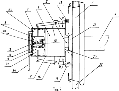 Работает вагон-самосвал следующим образом. Во всех случаях, когда вагон-самосвал находится в сцепе с локомотивом или же в составе грузового поезда тоже под локомотивом, запасный резервуар 25 содержит необходимый запас воздуха, находящегося под давлением, создаваемым компрессором локомотива (такой процесс хорошо известен в технике и подробно, например, описан в книге, представляемой в прототипе, на стр.448-449). При этом сжатый воздух через трубопровод 24 поступает в подпоршневые полости 23 корпуса пневмоцилиндра 8, удерживая поршни 9 в таком положении, как это показано на фиг.3. Такое положение поршней 9 соответствует сжатию пружины сжатия 10. В процессе движения вагона-самосвала машинист локомотива в необходимых случаях применяет служебное торможение, и тогда давление в запасном резервуаре 25 несколько снижается, и поэтому поршни 9 могут получить некоторое перемещение по стрелкам А под действием сжатой пружины сжатия 10. Однако такие перемещения незначительны, и двуплечие рычаги 18, связанные со штоками 17 поршней 9, не могут получать большой по величине угловой поворот по стрелкам В, такой, который бы вызвал поступательное перемещение по стрелкам С конической формы башмаков 19 и позволил бы им войти в пространство, образованное торцевой поверхностью 20 буксы 4 и ступицей 21 колеса 6. В том же случае, когда вагон самосвал находится в отцепленном состоянии длительное время от локомотива, за счет утечек воздуха из тормозного цилиндра и других устройств, входящих в пневмотормозную систему вагона, происходит истощение тормоза, и тогда под действием сжатой пружины сжатия 10 поршня 9 совместно с их штоками 17, постепенно передвигаясь по стрелкам А, поворачиваются двуплечие рычаги 18 по стрелкам В, и их конической формы башмаки 19 входят в пространство, образованное поверхностью 20 буксы 4 и ступицей 21, по стрелкам С, тем самым исключая возможное вращение колеса 6 колесной пары. Известно, что при поступлении вагонов в сортировочный парк их описанные устройства должны быть заблокированы. Для этого перед отцепкой локомотива вагонники на каждом из вагонов-самосвалов, где имеются описанные устройства самоторможения, поворачивают рычаги фиксатора 15 по стрелке Е, что способствует перемещению пальца 13 по стрелке F, и последний входит в имеющиеся отверстия скобы 11 и пластины 12, надежно соединяя их между собой. После чего рычаг фиксатора 15 фиксирует в этом положении широко известными в технике способами. Закончив маневровые работы по составлению поезда из вагонов-самосвалов и подав к нему локомотив, главная тормозная магистраль которого будет соединена с подобной поезда, вагонники переводят рычаги фиксатора 15 в направлении, противоположном стрелке Е, что способствует выходу пальца 13 из отверстий скобы 11 и пластины 12 в направлении, противоположном стрелке F. Далее описанные процессы могут повторяться неоднократно.