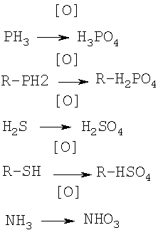 Детоксикация (обезвреживание) водорастворимых продуктов анаэробной ферментации (естественного гниения) навоза и птичьего помета: фосфина (РН3), фосфинов (R-PH2), сероводорода (H2S), меркаптанов (R-SH), аммиака (NH3), происходит в процессе окисления этих продуктов в прианодном пространстве электролизера и идет до образования фосфорной, серной, азотной кислот и их производных, соответственно по уравнениям: