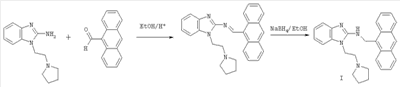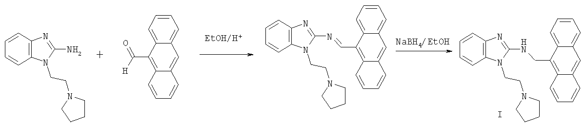 бензимидазола с 9-антральдегидом и восстановлением полученного 2-(9-ан-трилметилен)амино-1-[2-(1-пирролидинил)этил]бензимидазола боргидридом натрия до 2-(9-антрилметил)амино-1-[2-(1-пирролидинил)этил]бензимидазола (I).