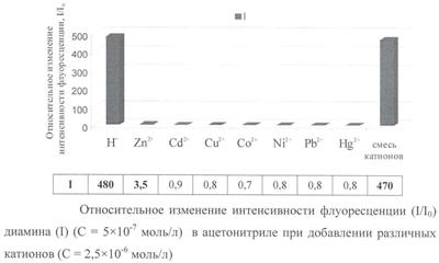 Селективность данного сенсора была показана при добавлении к исходному раствору амина I смеси катионов: Н+, Zn2+, Cd2+, Cu2+, Co2+, Ni2+, Pb2+, Hg2+ (каждый из катионов был взят в пятикратном мольном избытке относительно соединения I). В этом случае происходит увеличение относительной интенсивности флуоресценции (разгорание) в 470 раз. Как видно, отклонение интенсивности флуоресценции раствора соединения I с добавлением смеси катионов (H+, Zn2+, Cd2+, Cu2+, Co2+, Ni2+, Pb2+, Hg2+) от раствора соединения I с добавлением только трихлоруксусной кислоты (Н+) является незначительным и свидетельствует о высокой избирательности данного флуоресцентного хемосенсора по отношению к ионам Н+. Добавления триэтиламина, взятого в эквивалентном количестве (по отношению к добавленной кислоте), к кислому ацетонитрильному раствору амина I приводит к полному восстановлению исходной интенсивности флуоресценции, что свидетельствует об обратимости процесса протонирования сенсора I и возможности его повторного использования.